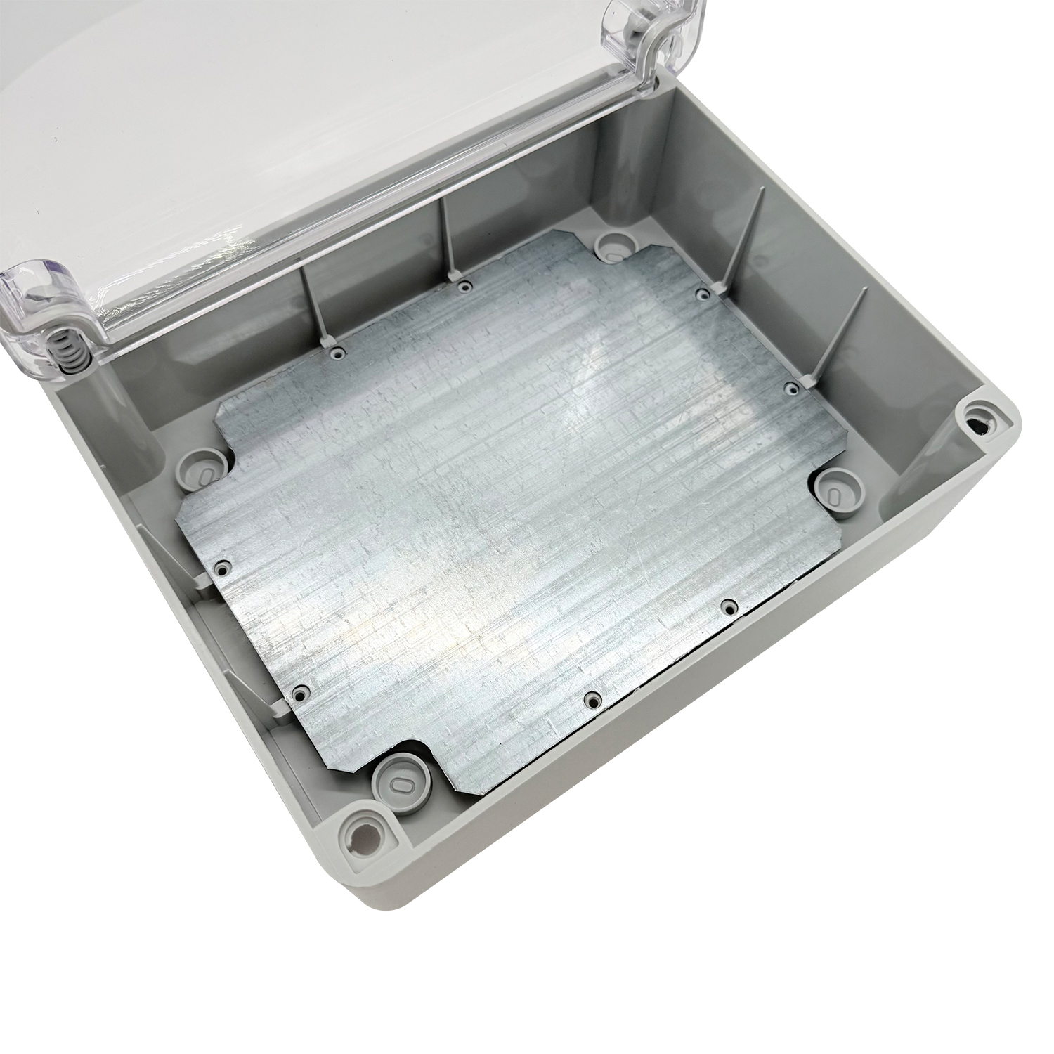 Progettata per il montaggio a parete, la scatola è dotata di guarnizione integrata perimetrale. Dettaglio pratico: il coperchio trasparente può essere agganciato durante il montaggio o la manutenzione senza doverlo rimuovere completamente. Ciò facilita la gestione e fa risparmiare tempo – nessuna necessità di appoggiare il coperchio.