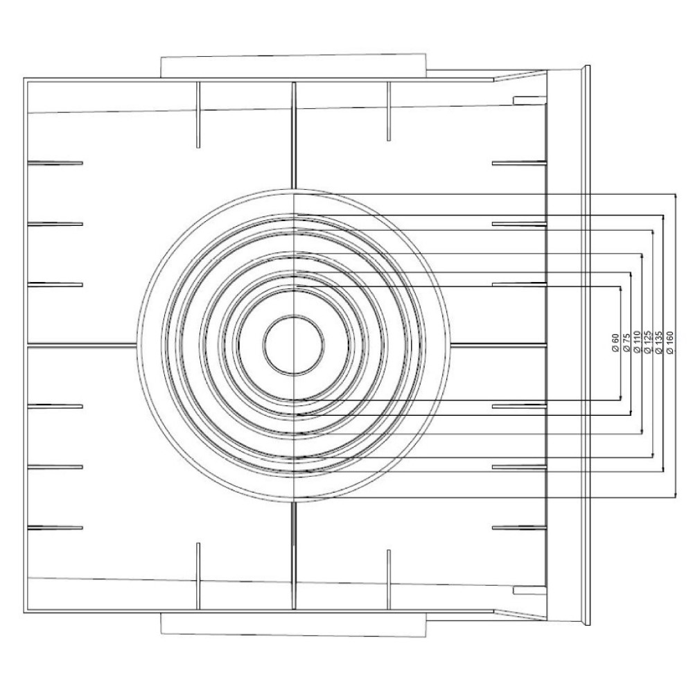 - Connessioni versatili: ingressi su tutti e 4 i lati (Ø: 60, 75, 110, 125, 135, 160 mm) per massima flessibilità