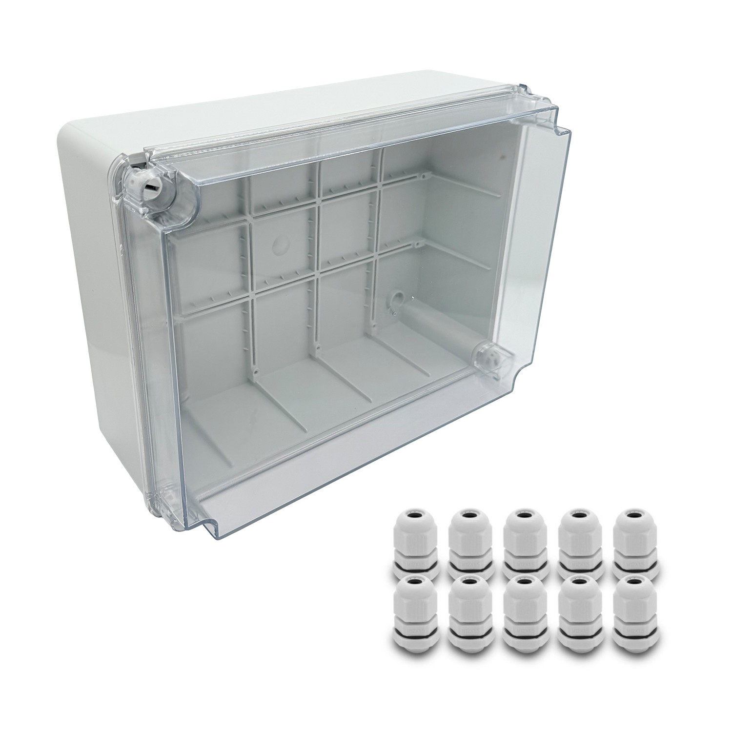ARLI Scatola di derivazione 310 x 230 x 130 mm con coperchio trasparente IP67 + 10 pressacavi M12 x 1,5 mm