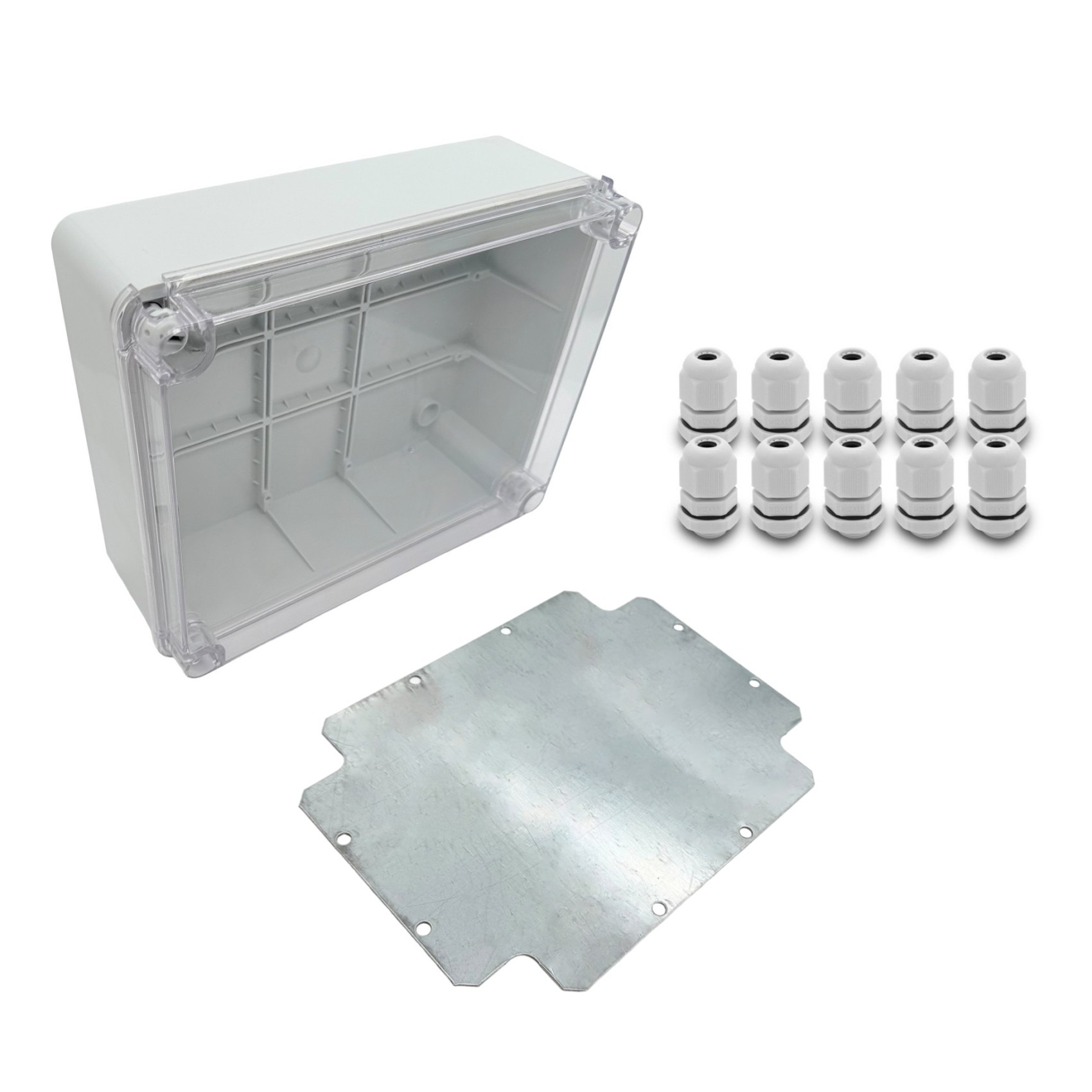 ARLI Scatola di derivazione 250 x 200 x 90 mm con coperchio trasparente IP67 inclusa piastra di montaggio + 10 pressacavi M12 x 1,5 mm