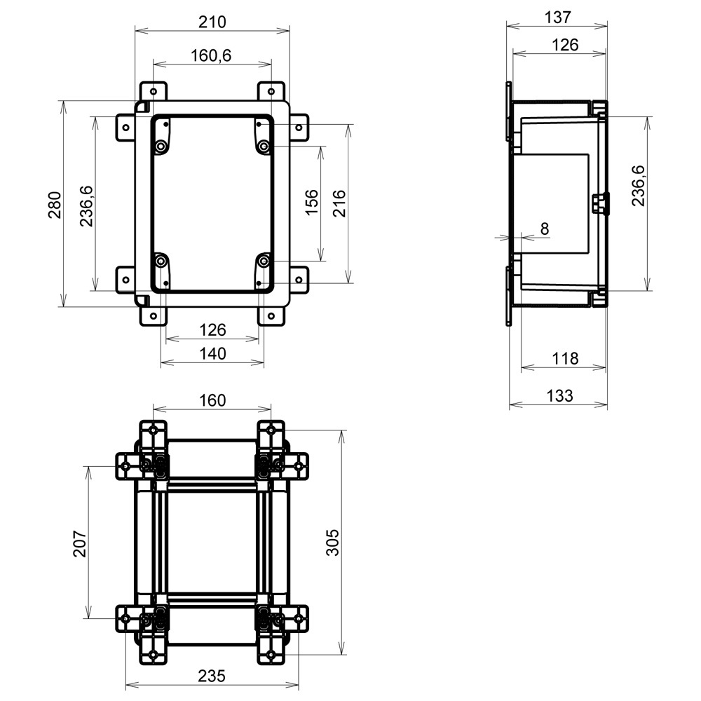- Dimensioni interne: 160,6 x 236,6 x 118 mm